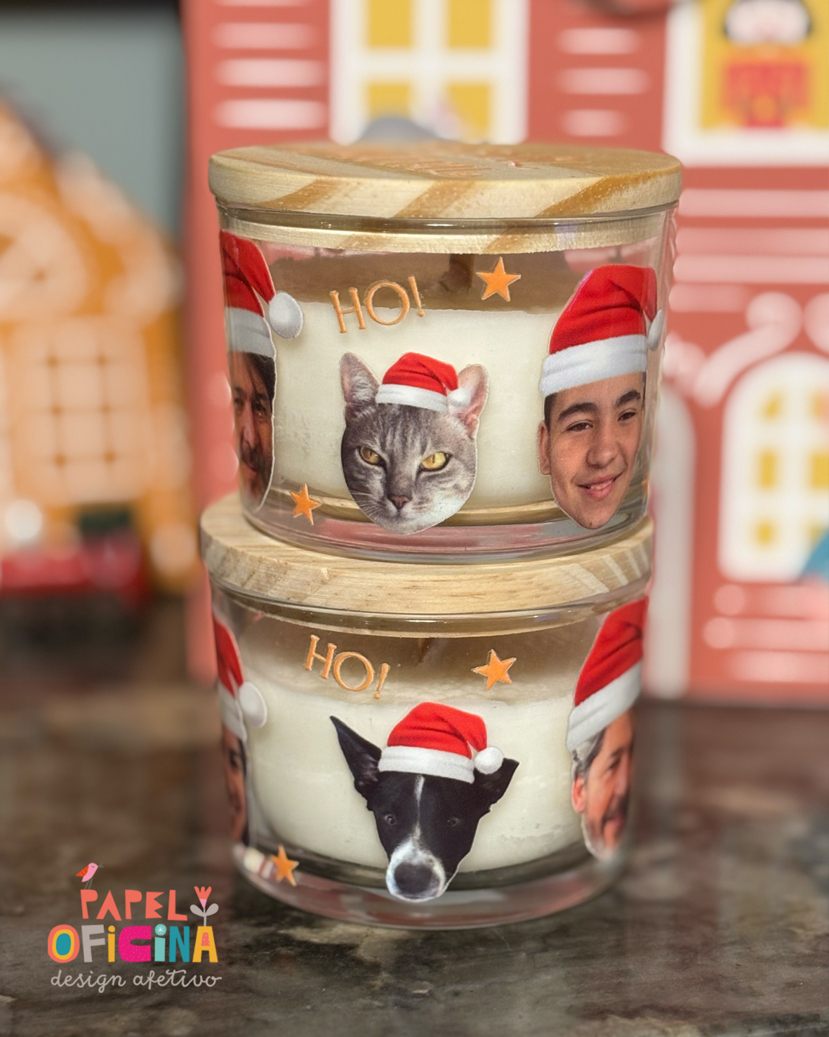 Feitas em pote de vidro, 150 ml, com tampa em madeira.