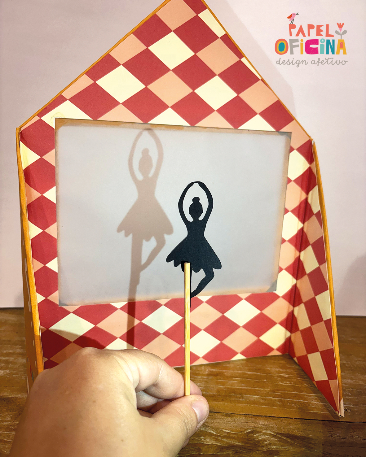 Teatro em formato de casinha de biscoito, com 21 cm de largura por 28 de altura (frente).